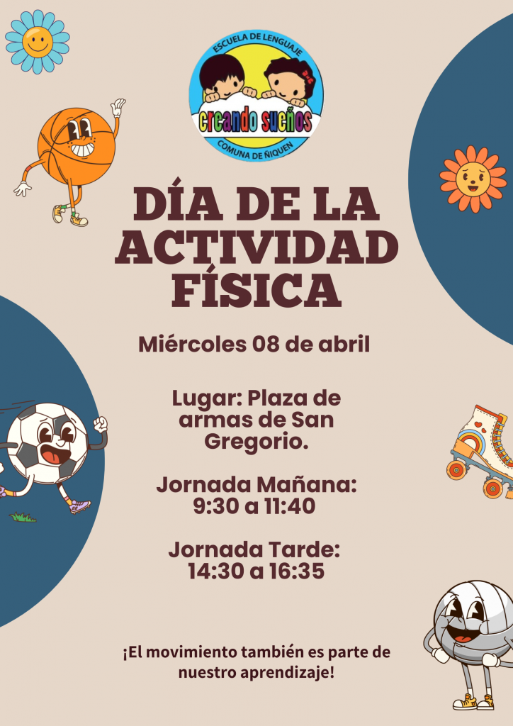 La Escuela de Lenguaje Creando Sueños celebra su Día de la Actividad Física el miércoles 8 de abril en la Plaza de Armas de San Gregorio, con jornada de mañana (9:30–11:40) y tarde (14:30–16:35).